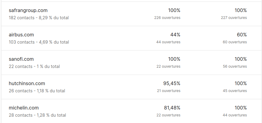 Malheureusement, vous n’allez pas forcément pouvoir compter sur votre outil d’envoi emaling pour faire le job. Et vous n’arriverez sans doute pas à être exhaustifs. Dans ce cas, vous pourriez essayer de détecter les domaines de destination qui ont des statistiques aberrantes. Cela vous permettra de les rejeter de vos statistiques afin d’avoir des taux de clic et d’ouverture qui se rapprochent de la réalité.