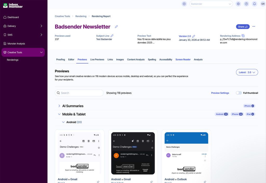 La qualité des images de rendu est très bonne ; cependant, en mobile, les images sont tellement grandes que cela rend leur visualisation peu pratique. L’outil fonctionne plutôt mal avec Firefox. Il vous faudra utiliser un autre navigateur pour en profiter pleinement. Il existe également des fonctionnalités de preview d’inbox, d’analytics, et de création de template email via un email builder. Je n’ai pas testé les deux premières, mais leur email builder semble également mal se comporter avec Firefox ET avec Chrome.