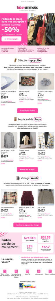 En septembre 2023, j’avais déjà réalisé une analyse de cet email promotionnel de Label Emmaüs dans notre rubrique “Exemples d’emails”. Plutôt que de répéter ce qui a été dit, je vous invite à consulter cet article pour en savoir plus.