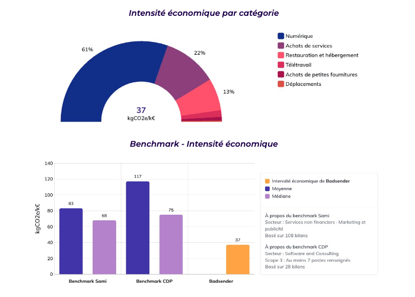 La deuxième partie du graphique ci-dessus compare l’intensité carbone de Badsender à celle d’autres entreprises des secteurs « Marketing et Publicité » ou « Software and Consulting ». Nous sommes bien en dessous des moyennes de notre secteur !