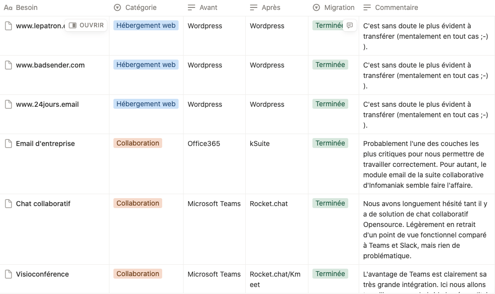 As you can see, a number of tools are not yet ready for migration. Most of the time because the migration would be complex or because no satisfactory OpenSource tool exists to host it at Infomaniak.